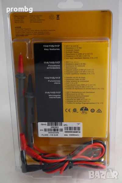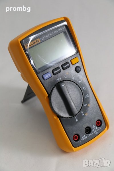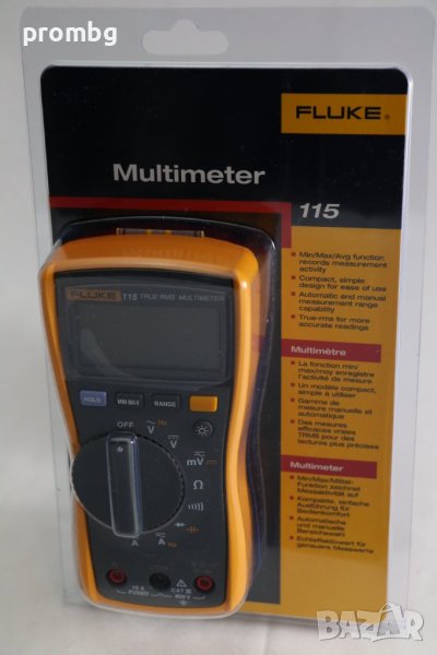 FLUKE 115 професионален цифров мултиметър, мултицет, внос от Германия. Компактен TRMS мултиметър за професионална употреба. Голям, светъл Led дисплей с подсветка. Измерване на съпротивление и тест за вериги. Измерване на капацитет и честота. Полупроводников (диоден) тест. Запис на мин., макс. и средна стойност на пулсации. Клас за безопасност CAT III, 600 V. Мин. чувствителност U DC: 100 µV / 10 MOhm; U AC: 100 µV / 10 MOhm; I DC: 1 mA; I AC: 1 mA; R: 100 MOhm; С: 1 nF; Честота: 10 mHz; Тест на диода: 1 mV; Тест за непрекъснатост: 1 Ohm. Комплектът включва; игитален мултиметър Fluke 115; сонди; противоударен калъф; батерия (9-V); Ръководство за употреба. Техническа информация: Дисплей 6000 показания, 33 сегментен