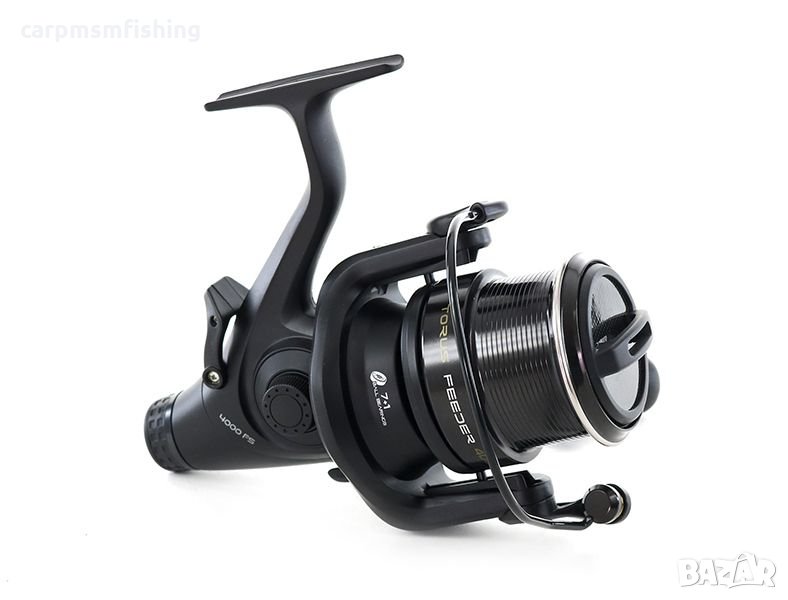 хранилки, и за риболов на по-големи риби на по-големи реки и езера. Torus Feeder 4000 FS има дълга конусовидна метална шпула с капацитет 0,30мм.-150м. и вградена червячна система. Отличен преден аванс. Тази макара има 7 + 1 лагера, анти-усукваща система, здрава дръжка с удобна гумена дръжка. Оборотите на макарата са 4.6: 1. С едно завъртане на дръжката се навива 90 см влакно.