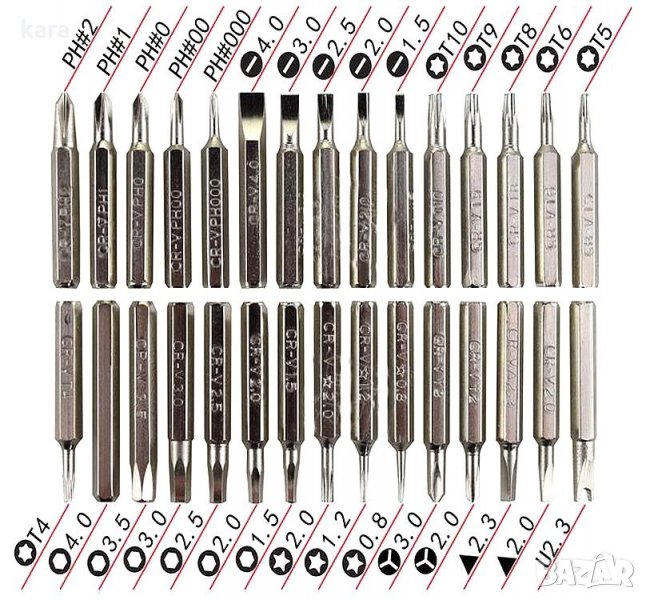 Мултифункционален комплект от 32 части мини отверки за работа с мобилни телефони, компютри, в електрониката, часовникарството, домашен майстор. Битовете са изработени прецизно от хромирана ванадиева стомана. Магнитна отверка с гумирата дръжка удобно в ръката без приплъзване.