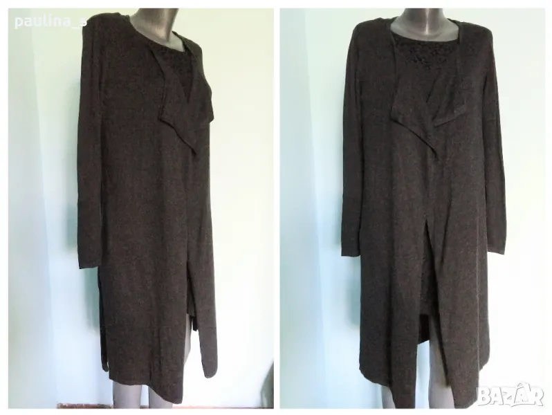 2️⃣. Колаж / "Indiska". Цената е крайна 24,99лв / 12,5 евро. Дълга памучна(памук 50%/вискоза/полиамид) жилетка тип наметка или туника с издължена задна част и цепки, универсален размер, отворен модел. Трикото дава възможност да се носи от няколко размера, една бройка, като нова, без дефекти и етикет.