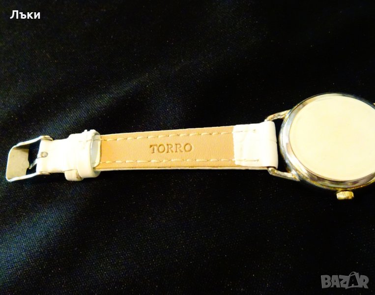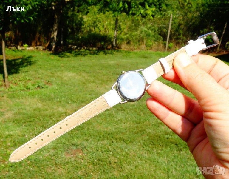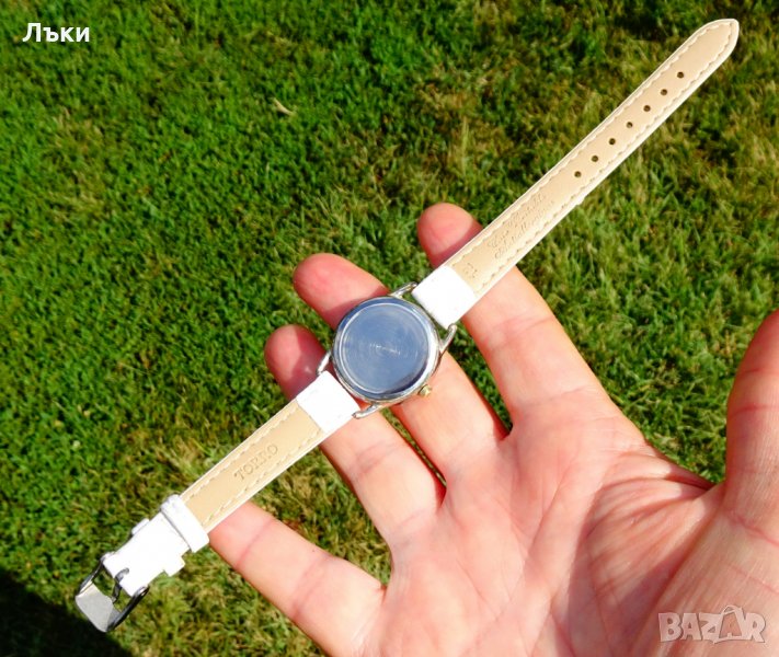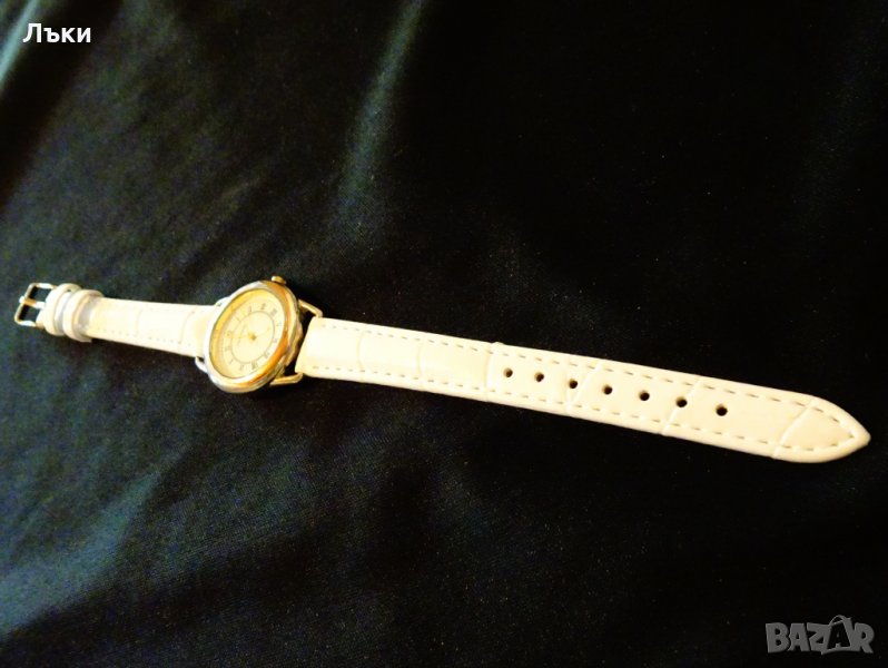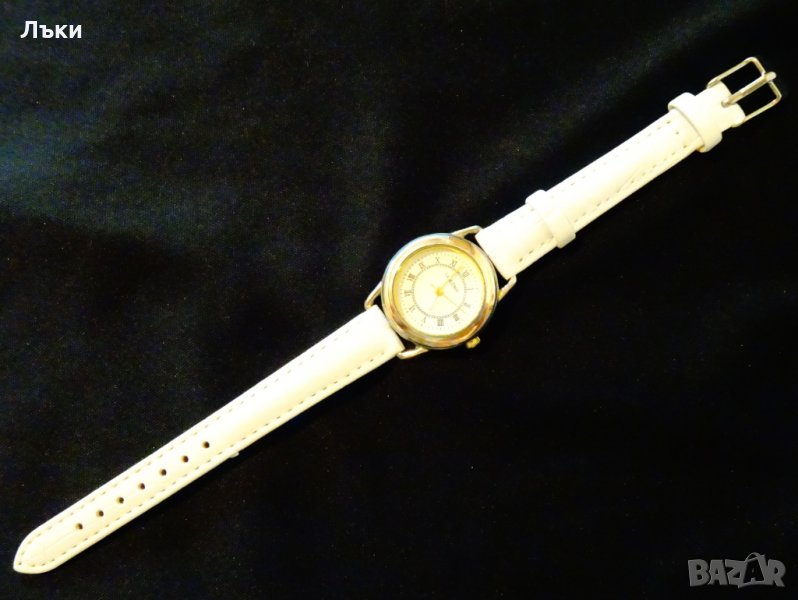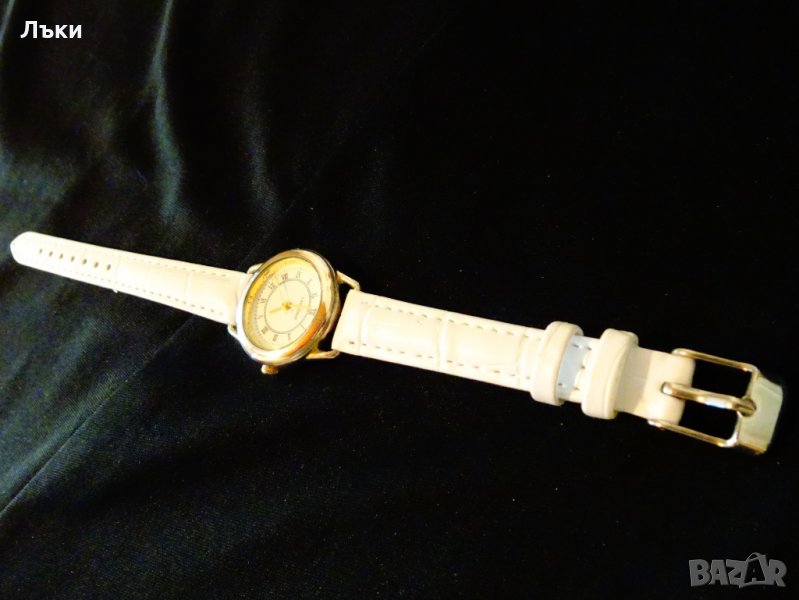 с римски цифри.Позлатени стрелки.Стъклото не се надрасква.Чисто нова кожена каишка.Дължина 21 см.,ширина на каишката 12 мм.Размер на касата 3 х 3.5 х 0.6 см.Работи перфектно и точно с чисто нова батерия.