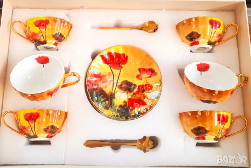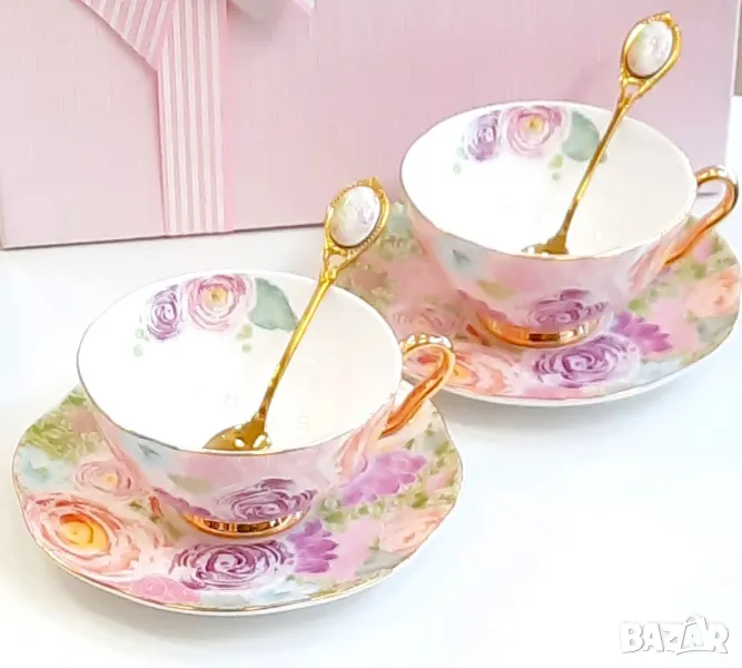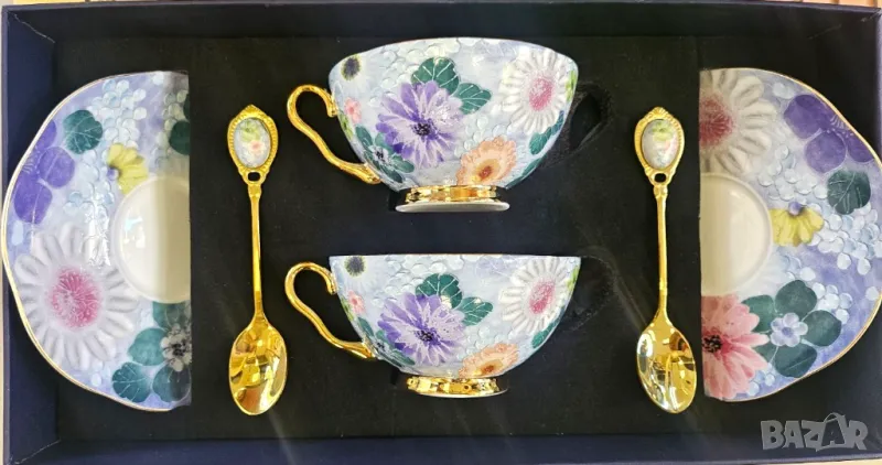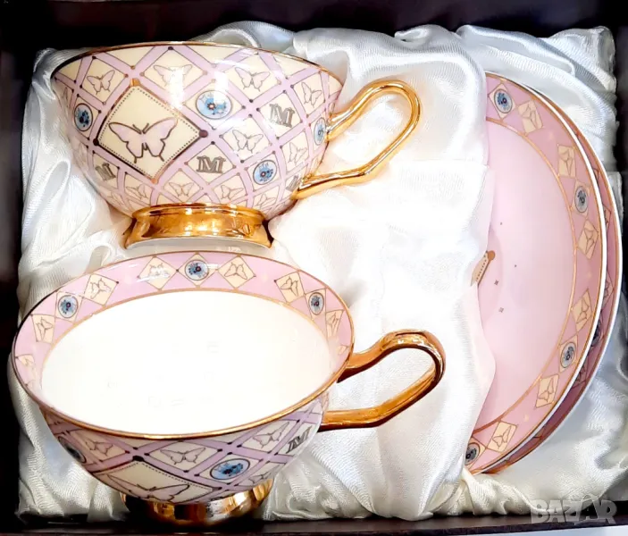 Комплект за чай, кафе или капучино от висококачествен костен порцелан включително и вътрешната част на чашите и ръчно рисувано злато по дръжката, столчето и ръба на чашите.