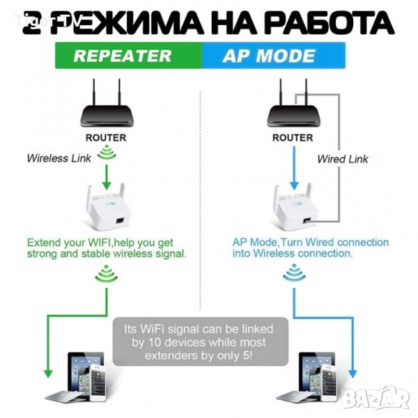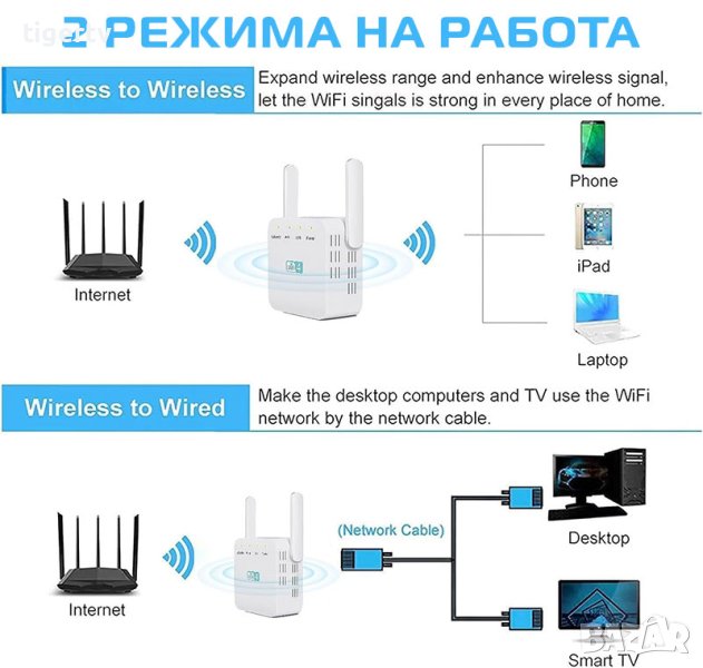 Усилвателят предлага два основни режима на работа: безжичен и като аксес пойнт. Какво означава това? Безжичният режим позволява да използвате сигнала идващ от собствения Ви рутер или пък от друго устройство– телефон, таблет. За връзката е необходимо да знаете името и паролата на мрежата.
