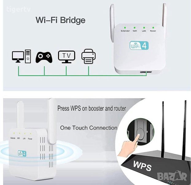 Вградени 2 х антени, осигуряващи WiFi до 300Mbps. Разрешете проблема със слаб сигнал по отличен начин. С функцията Wifi Range Extender, гледането на HD и 4К видео или филм в спалнята или градината вече няма да бъде голям проблем.