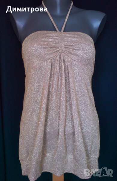 Страхотен, секси топ от фино машинно плетиво в златисто, подходящ за парти или клуб.