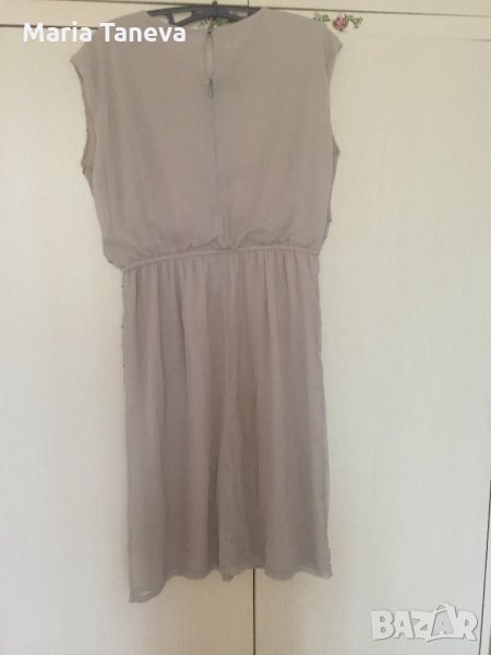 Дамска рокля-официална от лека материя в цвят "мляко с кафе", платът е с бродирани мъниста.В талията е с ластик.Дължината на роклята е 97 см, в талията обиколката е 76 см, без разтягане. Горната част пада лежерно над талията.Роклята е с подплата.