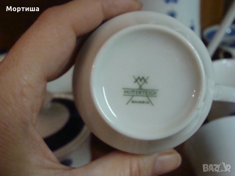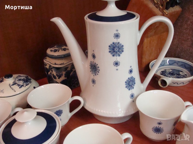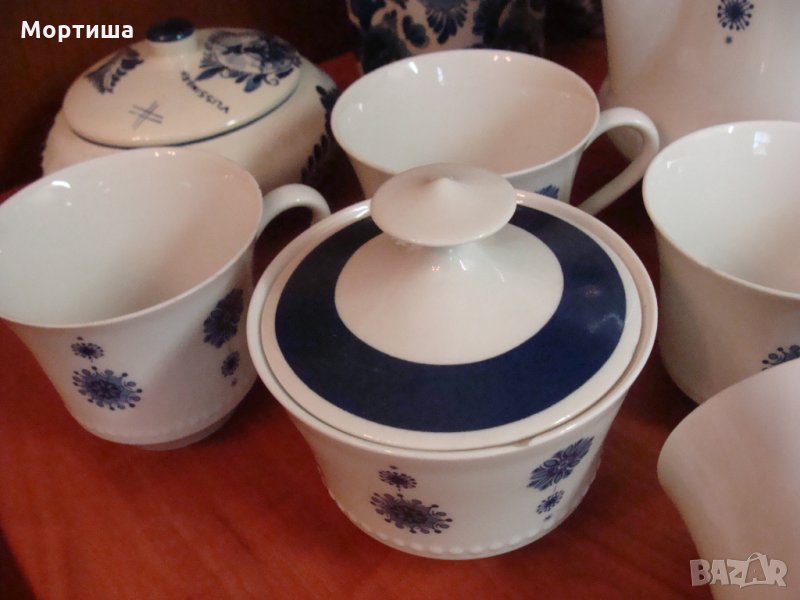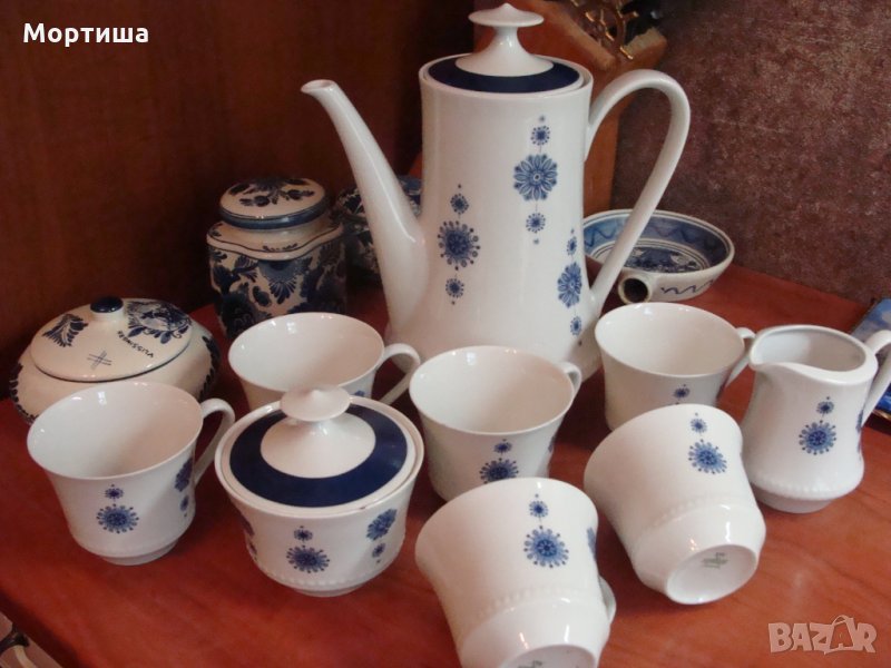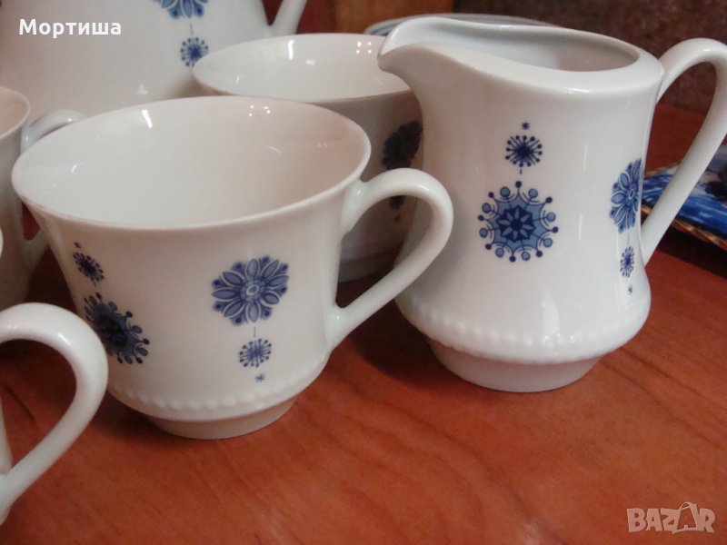 Сервиза се състои от 9 части няма чиний Чаши вис 7 диам 8 см ,каничка за мляко 9 см .захарница в 7 д 8 см кана вместимост 2 литра .Дребни забележки по някой от чашите и захарницата нищо фрапиращо ( съобразено е с цената )Сервиза е с антикварна стойност и е част от колекция КРАЙНА ЦЕНА БЕЗ БАРТЕРИ