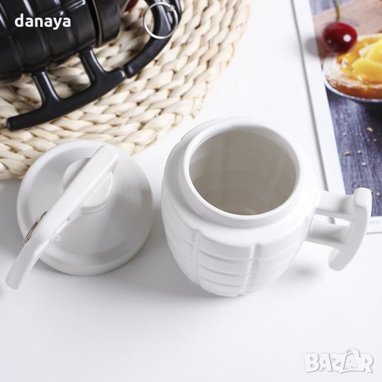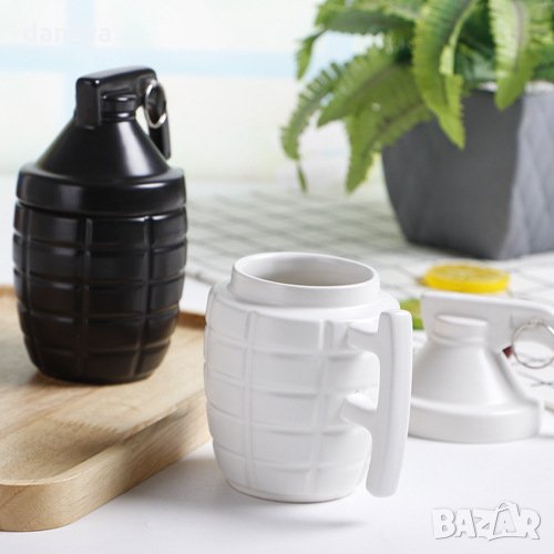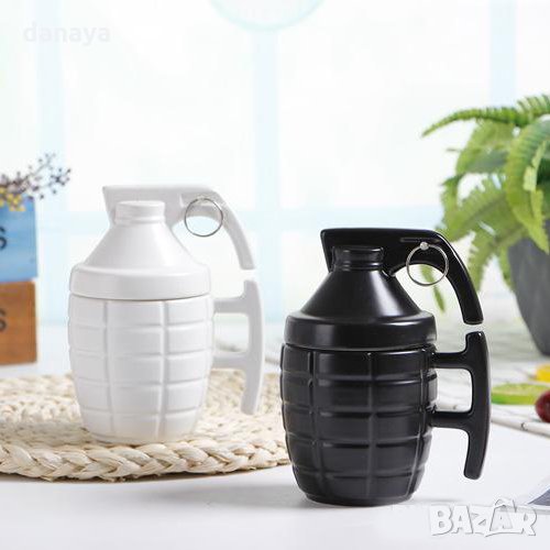 Подаръчна чаша с форма на ръчна граната. Бяла или черна чаша за чай Grenade Mug с удобна дръжка и капак. Перфектен подарък за любителите на военни филми или екшън игри. Предлага се в два цвята - бял и черен