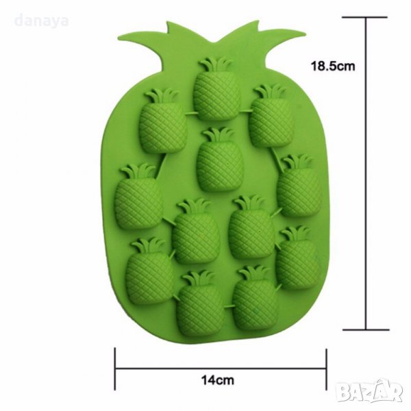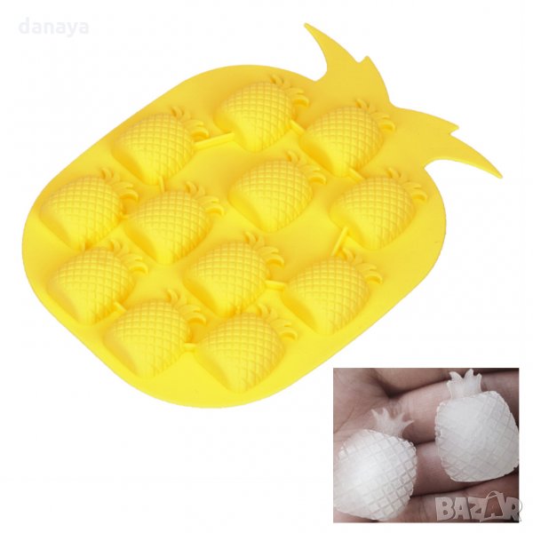 Силиконова форма за лед или шоколадови бонбони. Силиконови форми за ледени кубчета под формата на ананас. Всяка тавичка има по 12 гнезда. Формата може да се използва и като молд за шоколадови бонбони, фондан, декорация на торти и сладкиши. Предлага се в два цвята - зелен и жълт.