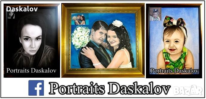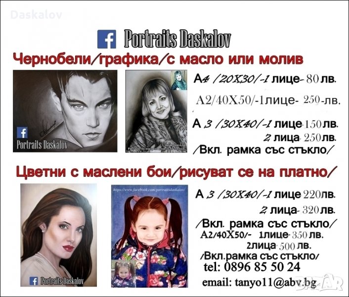 Здравейте! Рисувам портрети повече от 20г. с различни материали и техники.Маслените портрети се рисуват на платно ,като в цената е включена рамка с покривно стъкло.Има подробно описание на ценоразписа на последната снимка.Отстъпки за повече лица!Може да се свържете с мен на- f/Portraits Daskalov/ или тел:0896 85 50 24 .