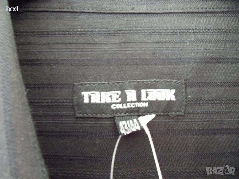 Продавам черна мъжка риза с дълъг ръкав марка "Take a Look". Размер 43/44. Купувана от Франция! Разстояние между подмишниците: 58-59см! Дължина от яката до края на ризата: 82см.