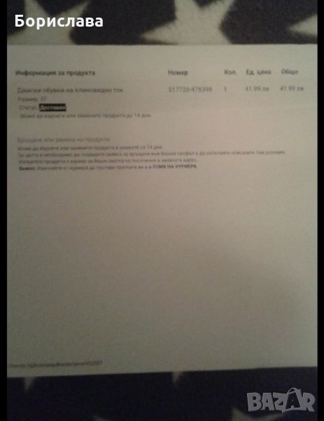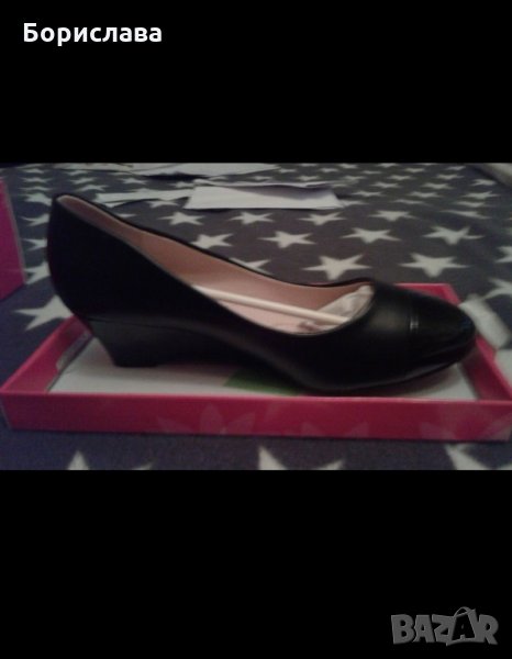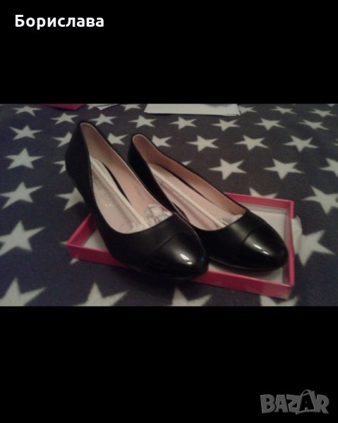 Дамски обувки на клиновидна ток.Цвят черен.Кожа и лак.Купих обувките,но са ми малки не са ползвани нито веднъж,на 13.04.2018година. съм ги купила.