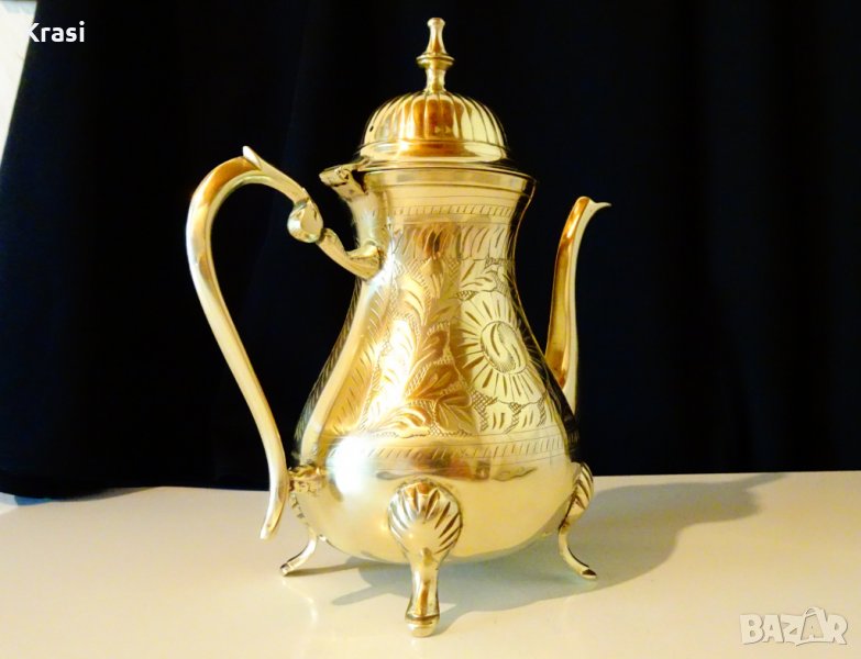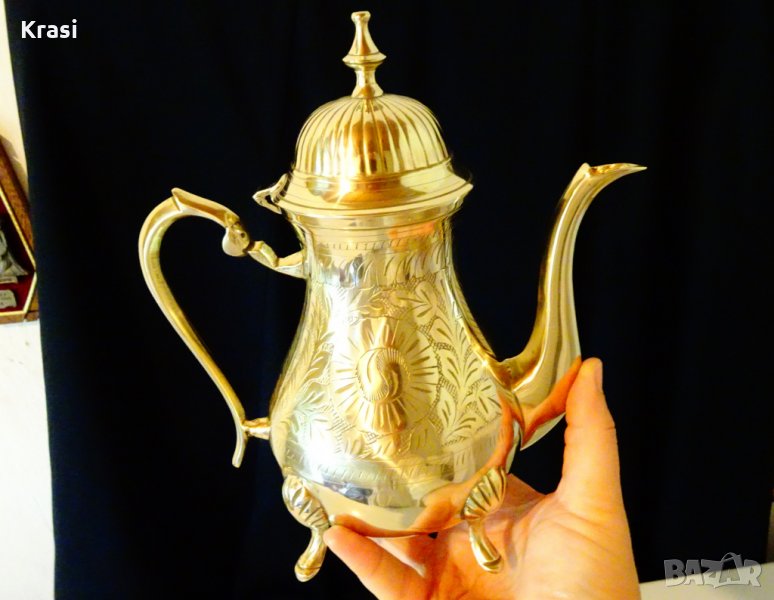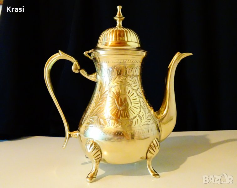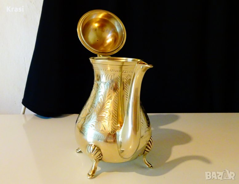 Старинна английска кана,чайник,майсторска ръчна изработка от масивен високо качествен бронз със златен блясък.Декорирана с великолепни релефно гравирани цветя и красиви орнаменти.Има 4 стабилни много елегантни релефни крачета.Блести от вън и от вътре,идеална за позване като кана за ракия,кафе,чай.Височина 21 см.,дължина 20 см.,диаметър 10 см.,тегло 710 гр.Вместимост 1 л.