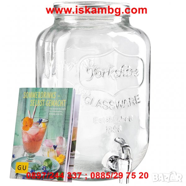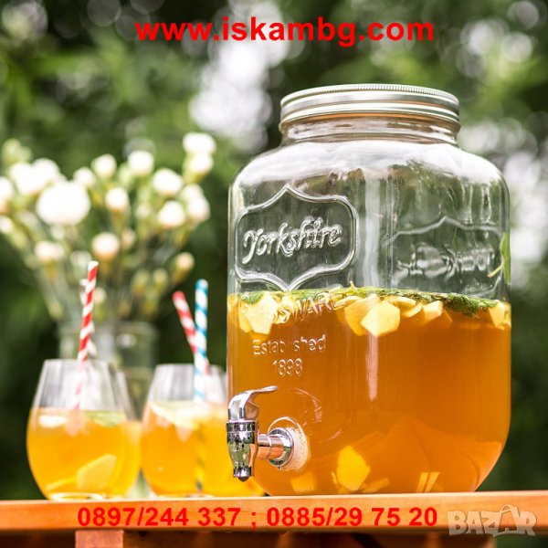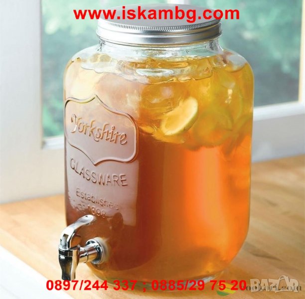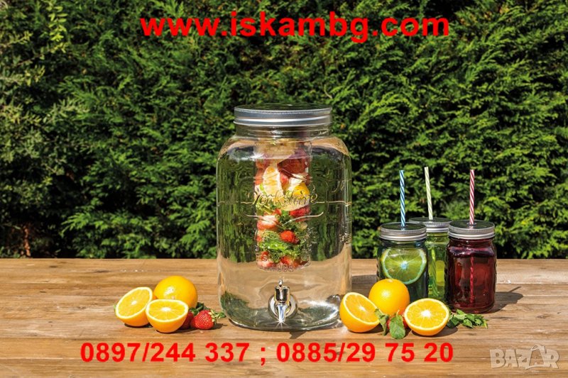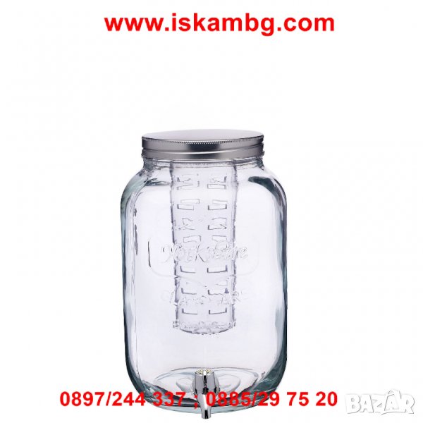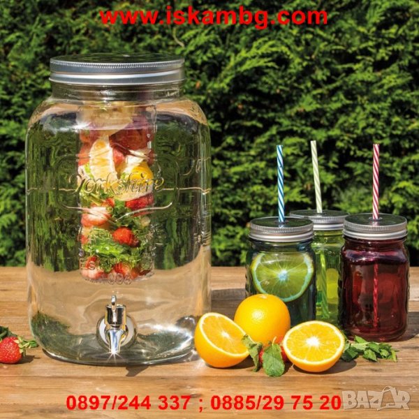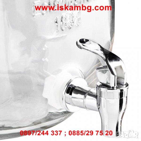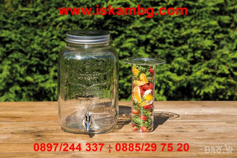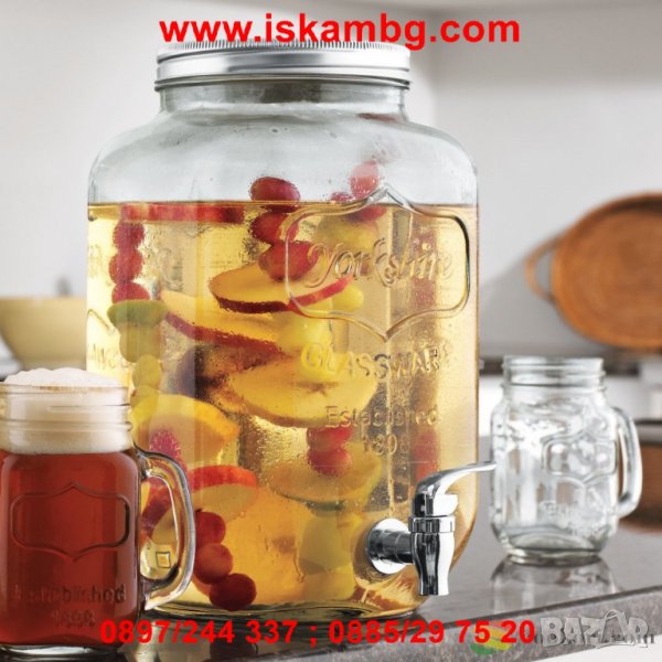 Диспенсъра е идеален за летни напитки, слабо алкохолни коктейли, сангрия (качествено бяло или червено вино с плодове по ваш избор, особено актуално за зимните месеци) и др. Широката гърловина позволява лесно да напълните буркана с лед или нарязани плодове. Този винтидж стъклен канистер има метална капачка на резба и канелка/кранче за удобно дозиране на напитката в чаша.