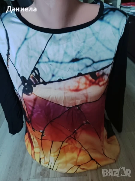 Блузата е съчетание на вискоза и памук и еластан на гърба, черна основа. Размера по скоро е L.