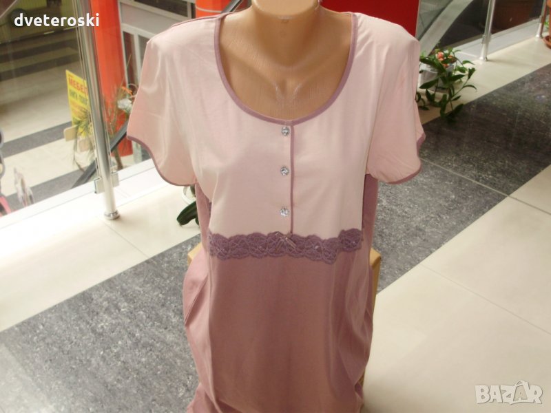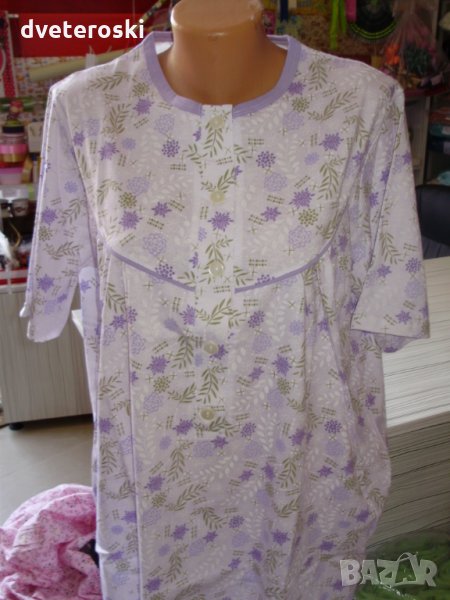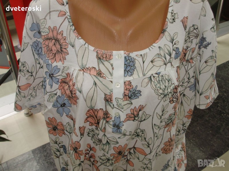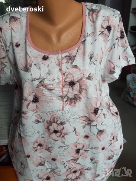 Модела с къс ръкав, 3 копчета, бяла с розови цветя е 100% памук– 23,00лв. Размери за ХL: дължина 95см., ширина под мишници 54,5см.