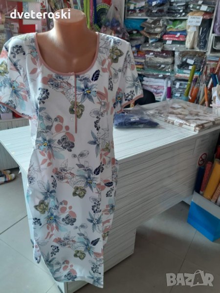 Нощница в бледо прасковено на цветя и три копчета – 22,00лв. 100 % памук. Размери за ХL: дължина от рамото 107см., ширина под мишници 54,5см. ширина при талия 50,5см., ширина при ханш 55см. Долу се разширява до 67,5см., ръкавче 22см..