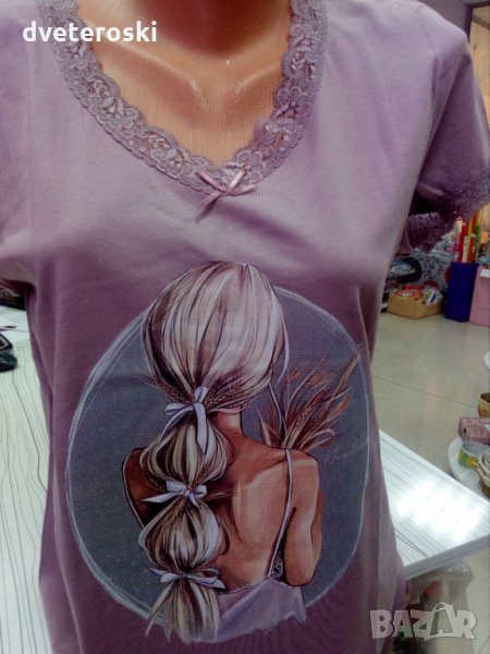 Лилавата с момичето е 50 % памук, 50 % модал на цена 22лв..