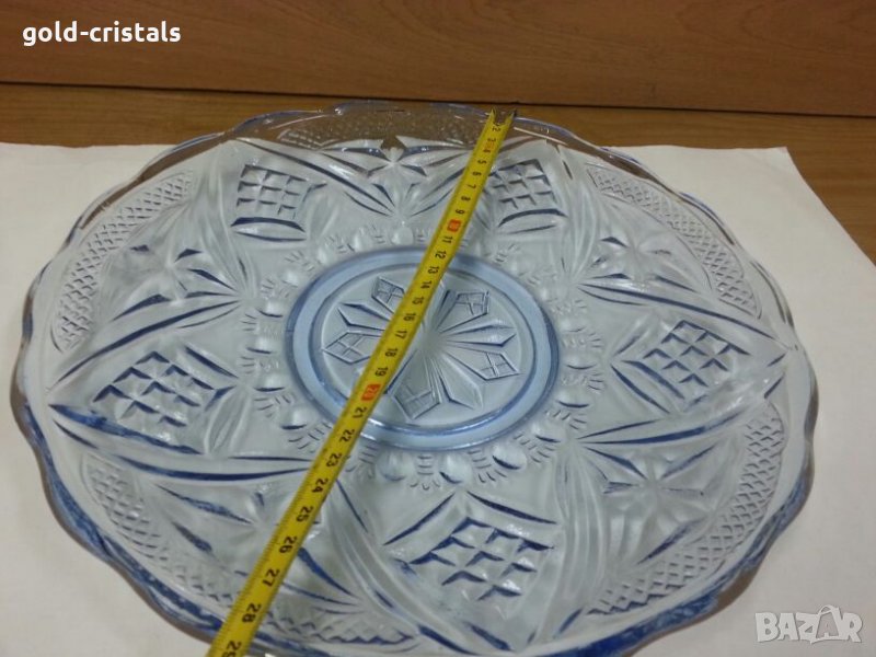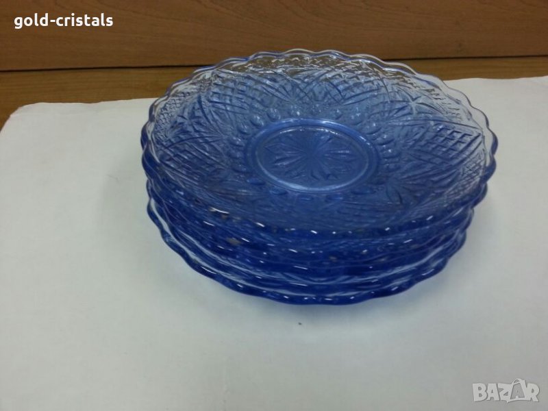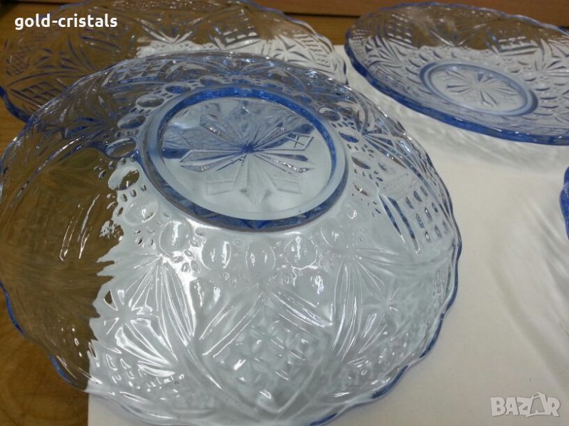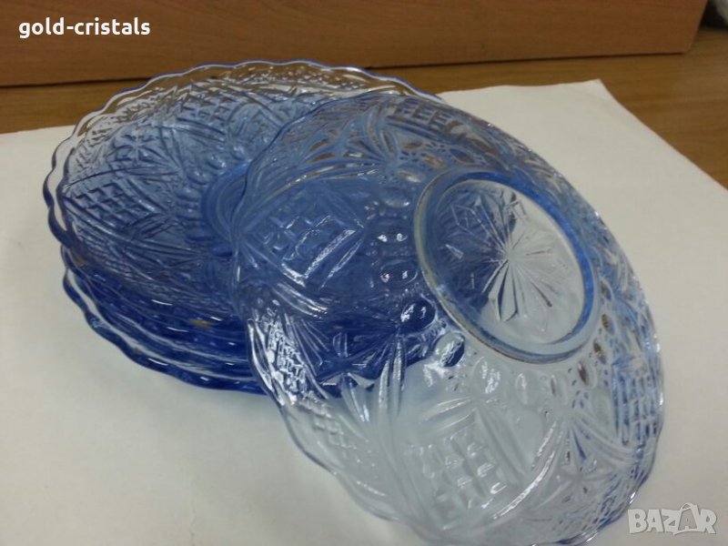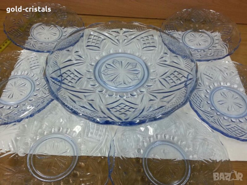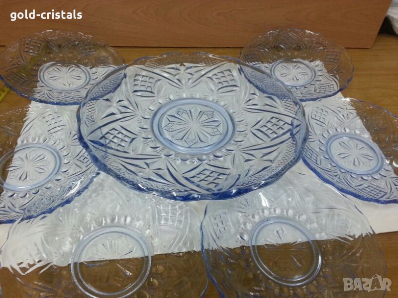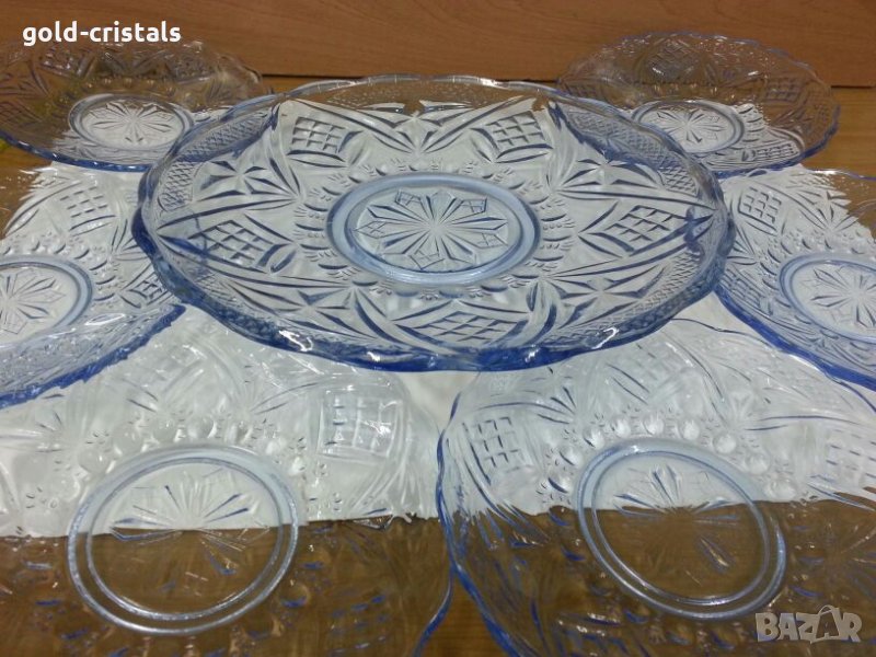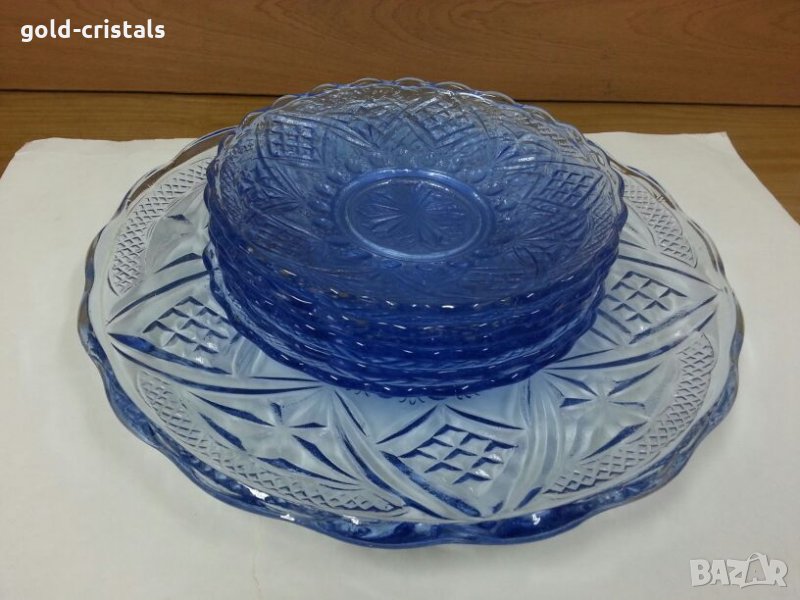 сервиз стъклени чинии една голяма чиния и шест чинийки цветно синьо гравирано стъкло комплект сет лот старинен стар ретро арт декор винтидж колекция кристално стъкло стари антикварни предмети обзавеждане за дома и семейството подходящи за подарък за ценители и колекционери