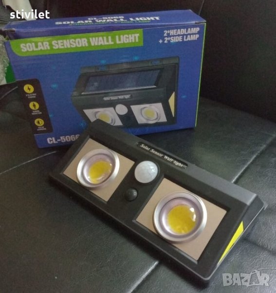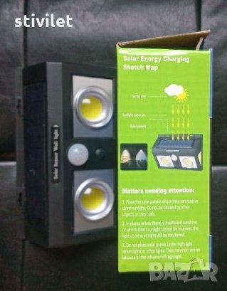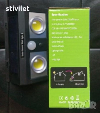 Соларна двойна LED Лампа + Датчик движение + вградена батерия.Ново → Обява 26195866