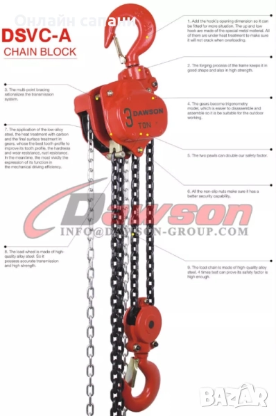• Висококачествена товарна верига от легирана стомана клас 80, която е безопасна и има дълъг живот.