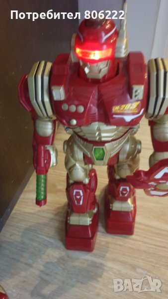 Робот боец. Има забележки. Издава звук и светлина, мигат очите и катарамата, издава електронен реалистичен звук на пистолета, подвижни оръжия, мигащи светлини, с дистанционното. Движи и ръце и глава. Работи с 4 бр аа батерии и 3 бр l44 за радиоконтрола. Към 30см е.