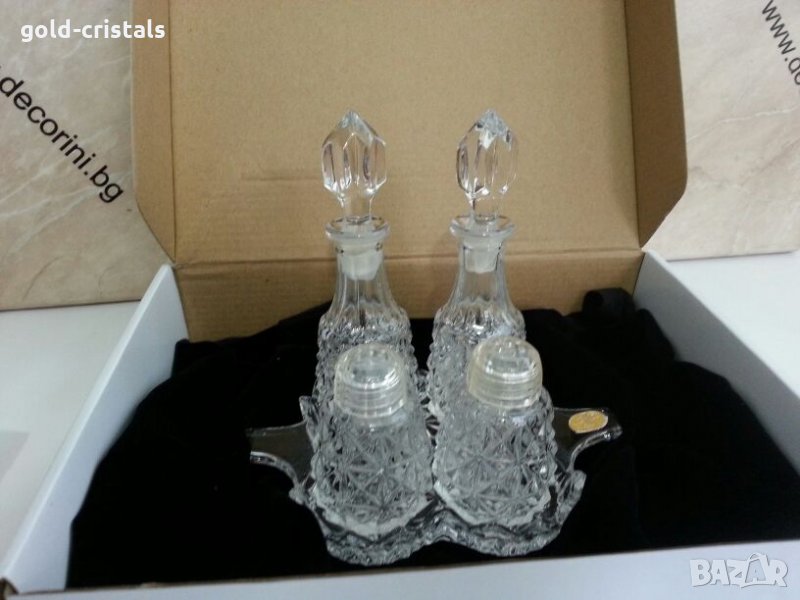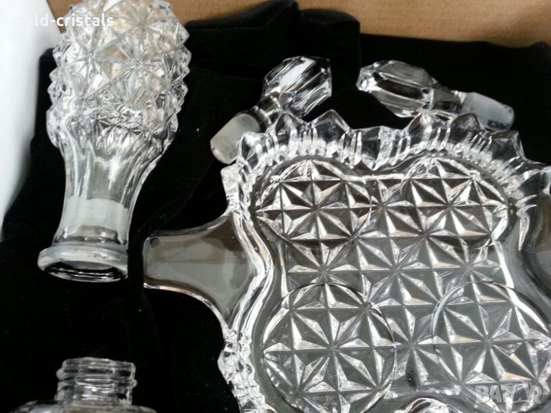 кристален комплект бохемия чехословакия комплект оливерници шишенцата солници и поднос неизползван с етикет кристално стъкло стар старинен ретро антикварни арт декор винтидж колекция стари сервиз сет лот стари антикварни предмети обзавеждане за дома и семейството