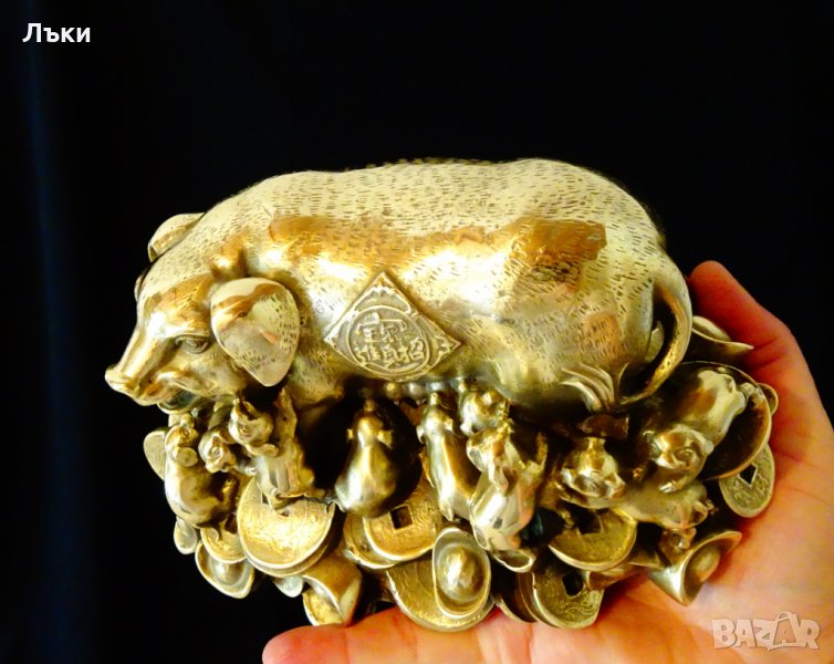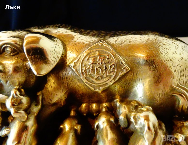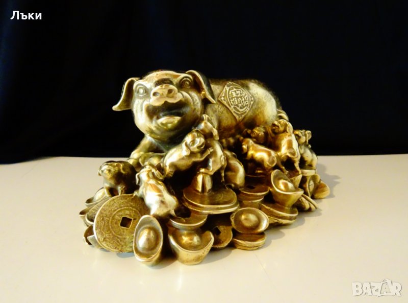 Старинна китайска статуетка фън шуй майсторска ръчна изработка от блестящ бронз.Мама Прасе с 12 малки щастливи прасенца.Едни сучат,други играят,а мама е легнала върху богатство – купчина златни монети и китайски златни кюлчета.Статуетката е създадена за посрещането на 1923 година – Година на Прасето,според китайския календар. Благоденствие,любов и щастие,греят на красиво изписано послание с китайски знаци.Фигурките на прасета са препоръчвани сувенири за късмет.