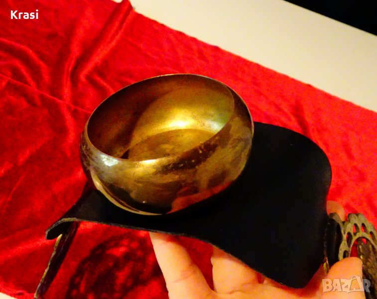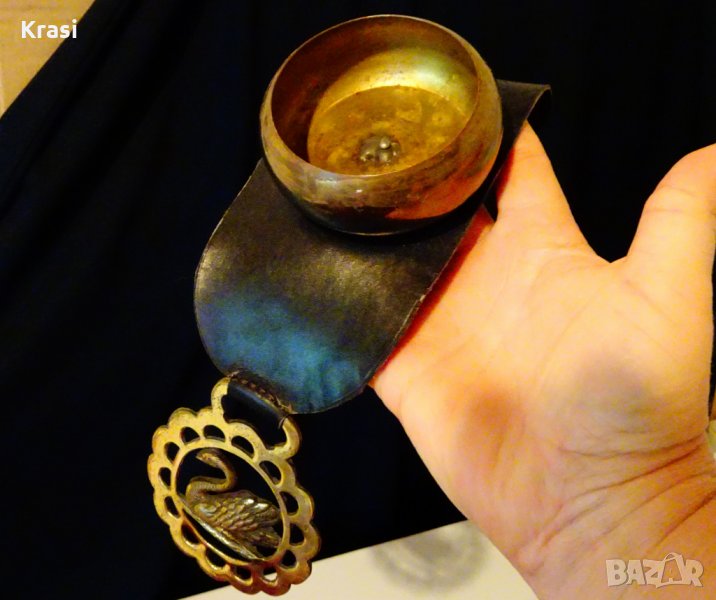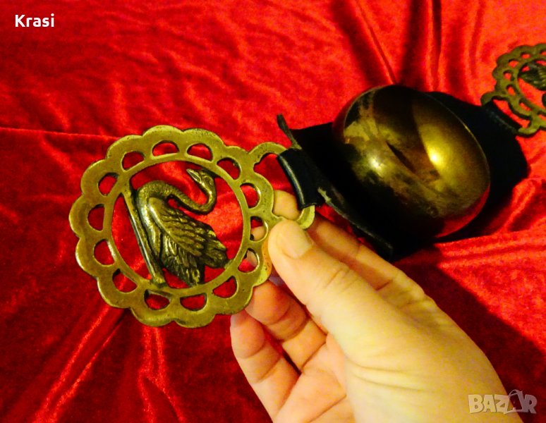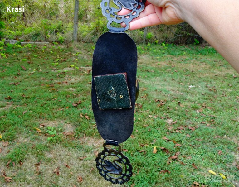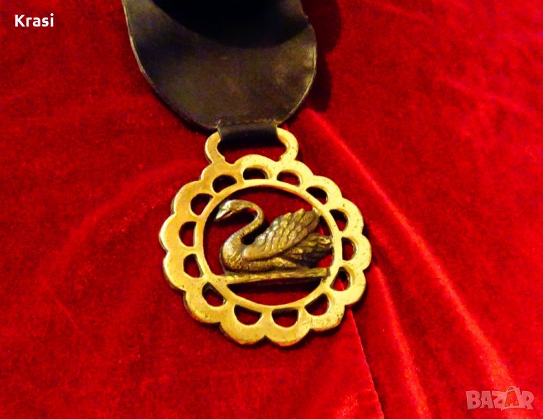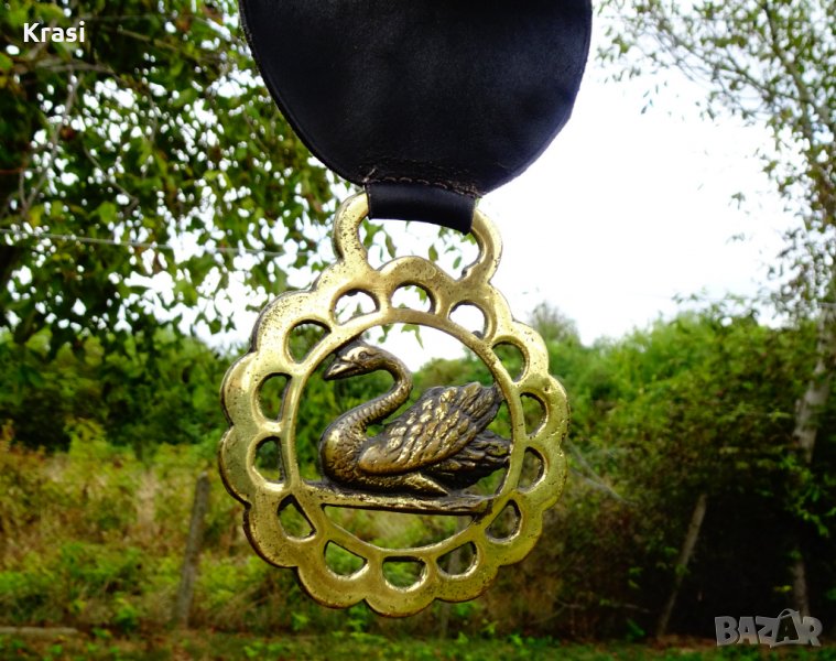 Старинна украса от конска сбруя,ръчно изработена от бронз,поставен върху естествена кожа и дебел гьон.Има ръчно отляти бронзови аликации с лебеди.Височина 4.5 см.,дължина 38 см.,ширина 8 см.Тегло 250 гр.
