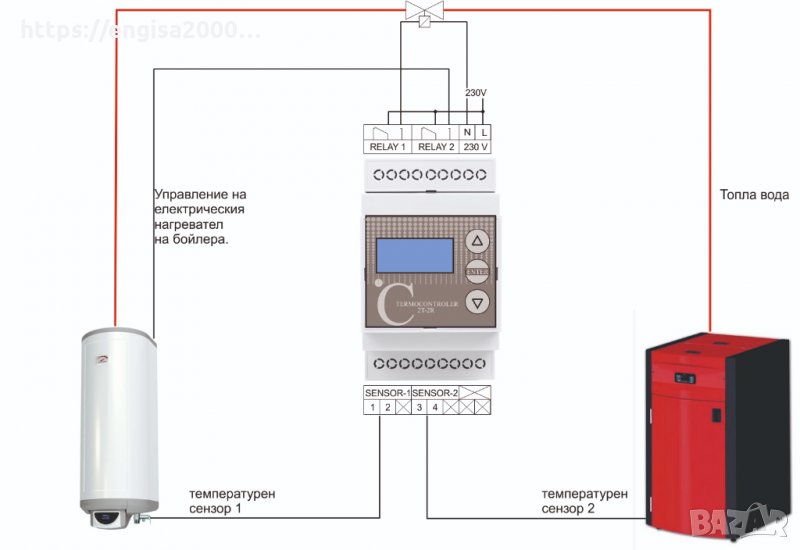 Устройството измерва текущата температура в системата с топла вода и бойлера посредством два температурни сензора. При спадане на температурата на водата в бойлера под зададената, контролерът превключва релейните си изходи в зависимост от условието: