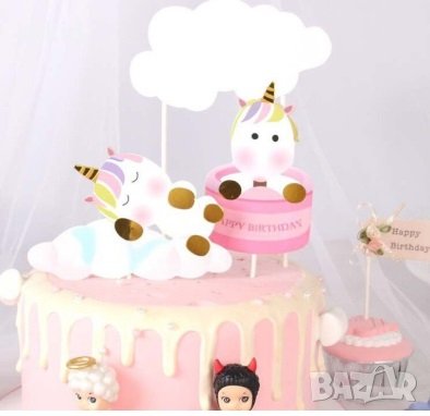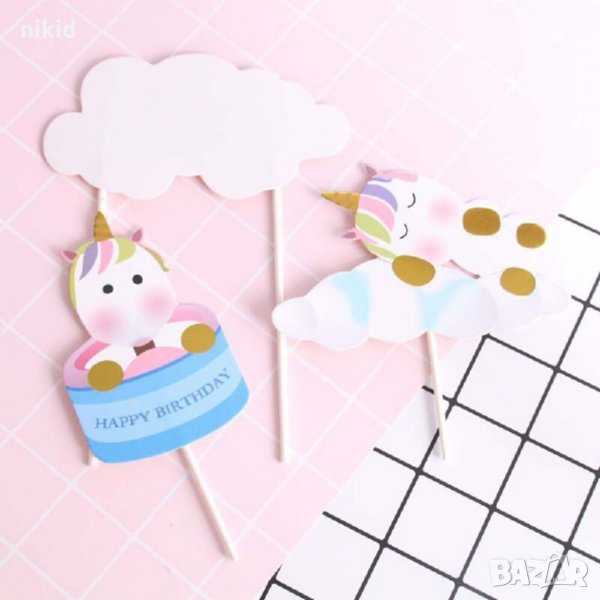 2 бр Еднорог Unicorn Happy и облаци картон топер топери клечки украса за торта декор парти → Обява 26233030