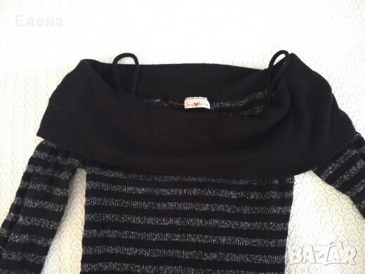 Дамска черна блуза на сребърни раета, не е дебела. Размер м., полиестер, вълна. Малко използвана.