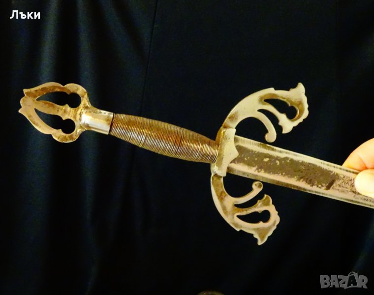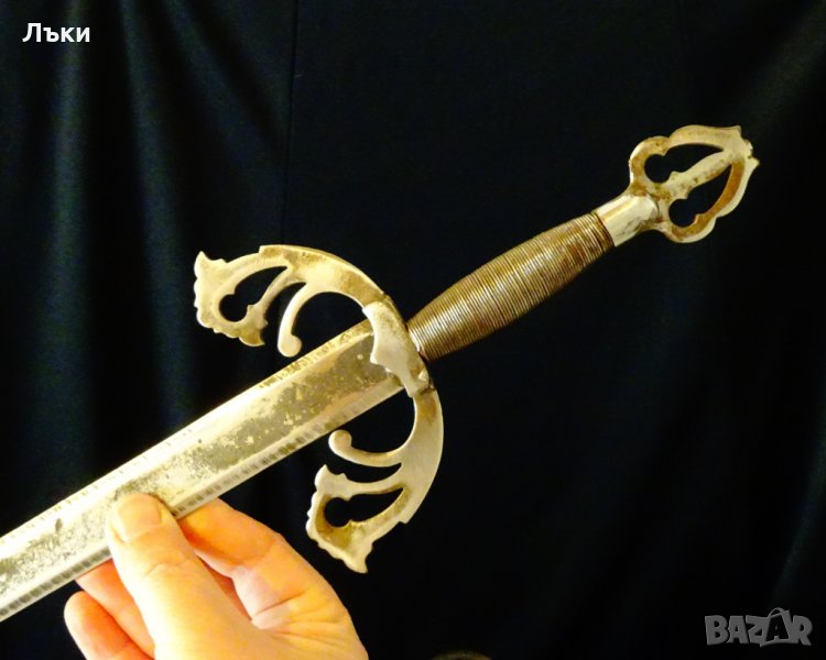 стомана.Меча не е сувенир.Острието е заточено има следа от маркировка,но не се чете.Дължина 53 см.Размери на острието 39.5 х 2.7 х 0.2 см.Гард 11.5 см.Тегло 300 гр.