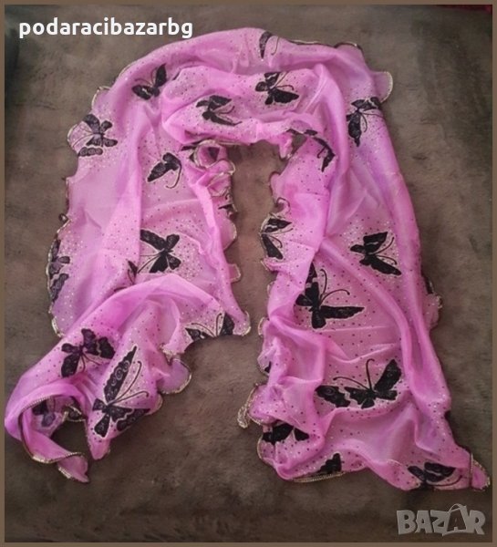 Ефирен дамски шал, съчетал в себе си фина материя, къдрави блестящи краища и черни пеперуди, с ефектния метален блясък на холограма! Това е аксесоар, който е абсолютно достатъчен, за да даде на жената нужния акцент, да я направи забележима, дори и