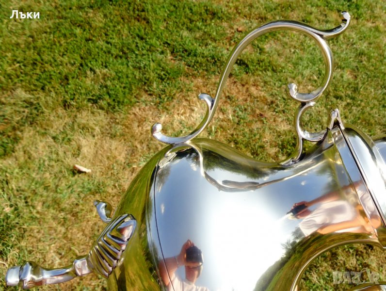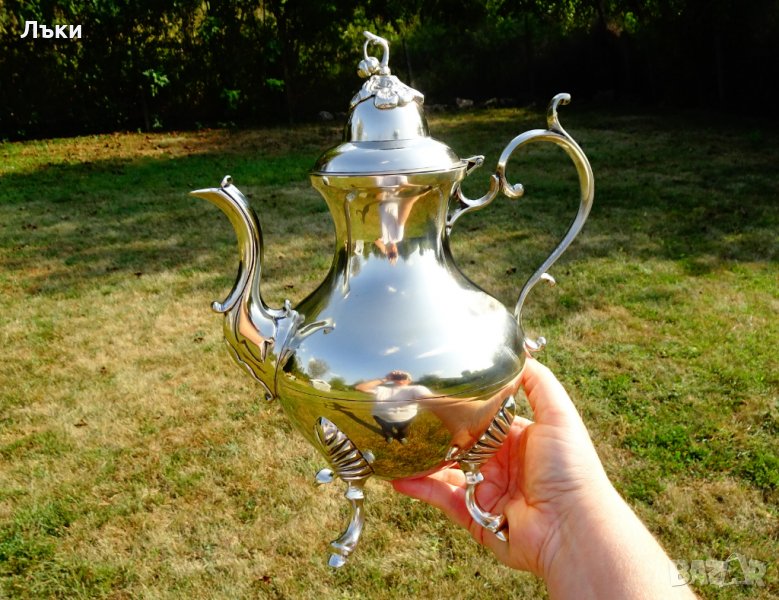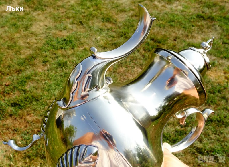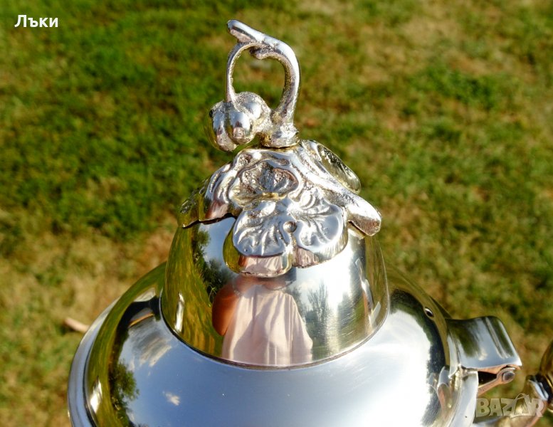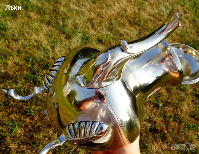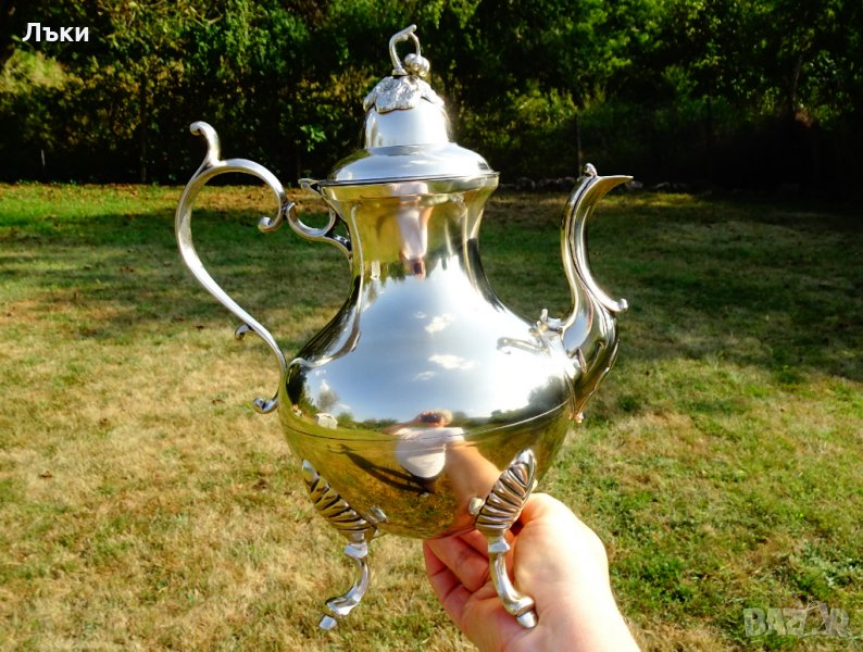 копитца.Капака на каната е декориран с нежно цвете,релефна апликация от сребро с проба 800.Кралска осанка и блясък.Височина 29 см.,дължина 24 см.,диаметър 16