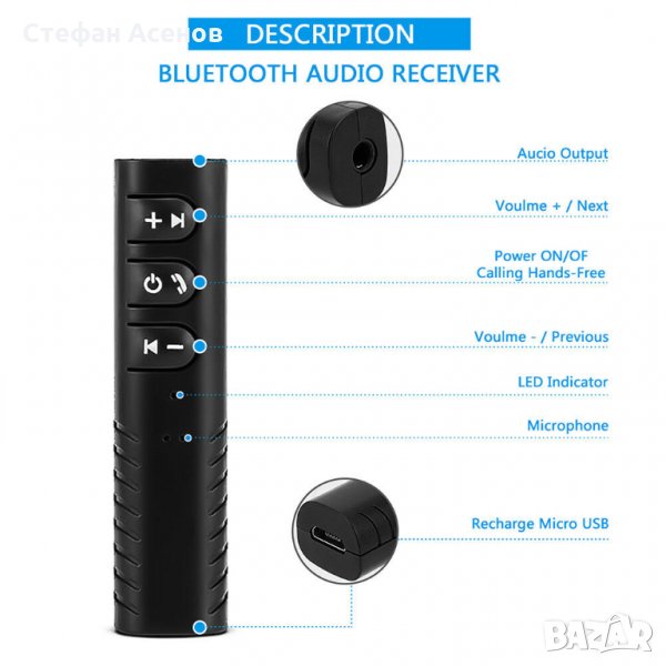 Премахнете кабелите и слушайте вашата любима музика от вашия телефон, таблет, лаптоп, компютър, през вашата домашна аудио уредба, аудио уредба на кола, слушалки, МП3 (MP3) или CD плейър използвайки Bluetooth комуникация между устройствата.Нов моден дизайн, мини размер и леко тегло. Подходящ за всякакви смартфони, компютри, авто техника с функция Bluetooth и AUX жак. Предназначен за включване към радиото на автомобила и слушалки, с което може да слушате музика на слушалите си без ограниченията на кабела или да използвате радио системата на автомобила си за провеждане на разговори благодарение на страхотния вграден микрофон. Вградената батерия издържа 4 часа.