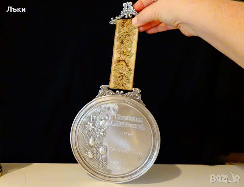 Старинно Западно Германско пано,плакет,майсторска ръчна изработка от 95% калай и 5% сребро,маркирано.Паното е релефно гравирано с букет красиви цветя и надпис Herzlichen
