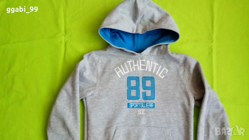 Суитшърт с качулка, ватиран, 122/128см, 70% памук, 30% полиестер. С нормални следи от употреба, без конкретни забележки.