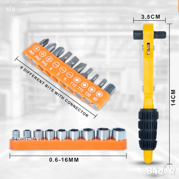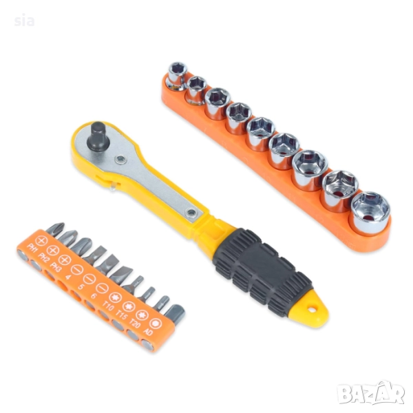 Комплект за универсална работа в дома, гаража или сервиз, включващ тресчотка с удобна ръкохватка и разнообразие от вложки и битове за различни видове крепеж.