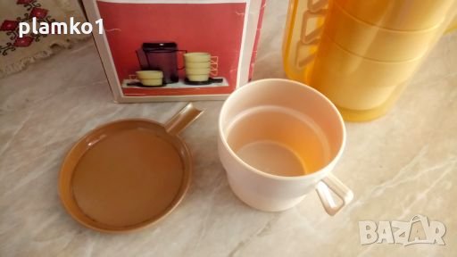 Сервиз пластмасов от 82ра година, има кутия и една забележка, макар и неизползван никога , човката на каната има малка пукнатина.