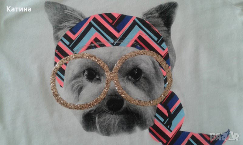 Асиметрична бяла блузка със сладка апликация в пастелни цветове и брокат.Размер на етикета 14 год.Обличана веднъж.Без следи от употреба.
