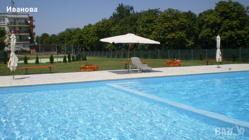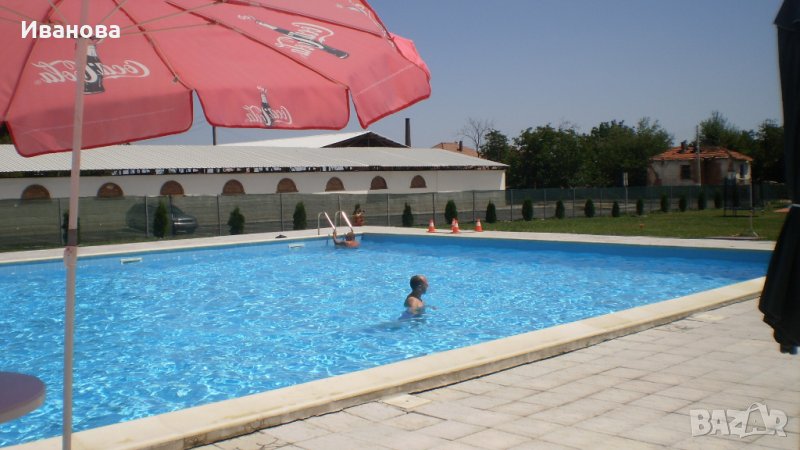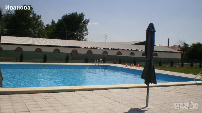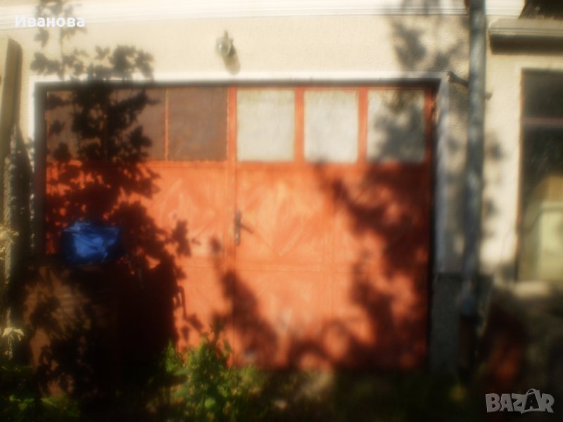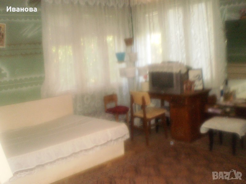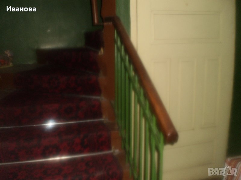 Едноетажната къща е отзад, разположение като гарсониера - голяма тераса - винкелово остъкление, две големи стаи, едната с ново дюшеме, другата на циментова замазка и баня - нова, никога не е ползвана /снимките в обявата/, отляво на къщата е гаража - голям с канал за сервиз и работилница, таванско помещение над цялата сграда и стълби от гаража тип мезонет, както голямо избено помещение под половината къща с масивни рафтове от винкел и дърво, дървен шкаф и избена част.