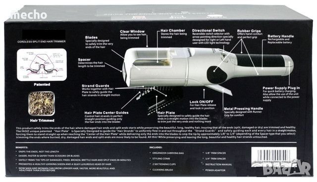 Премахвате безопасно върховете на повредената или чуплива коса за минути. Супер уреда отрязва краищата, но не и дължината на косата.Супер технологично устройство, което отрязва цъфтящите краища на косата, без да отнема от общата дължина.