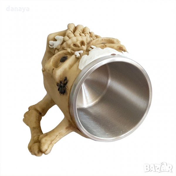 Забавна чаша череп декорирана с бяла пяна, паяк и голяма паяжина на гърба. Може да се използва като халба за бира или просто като екзотична чаша за напитки. Вътрешната част е изработена от неръждаема стомана, а отвън с полирезин. Оригинален и ефектен