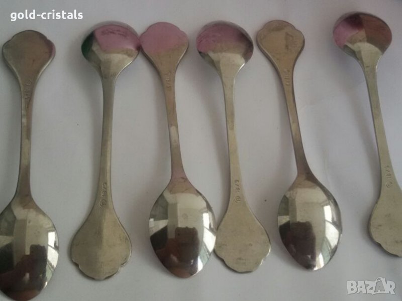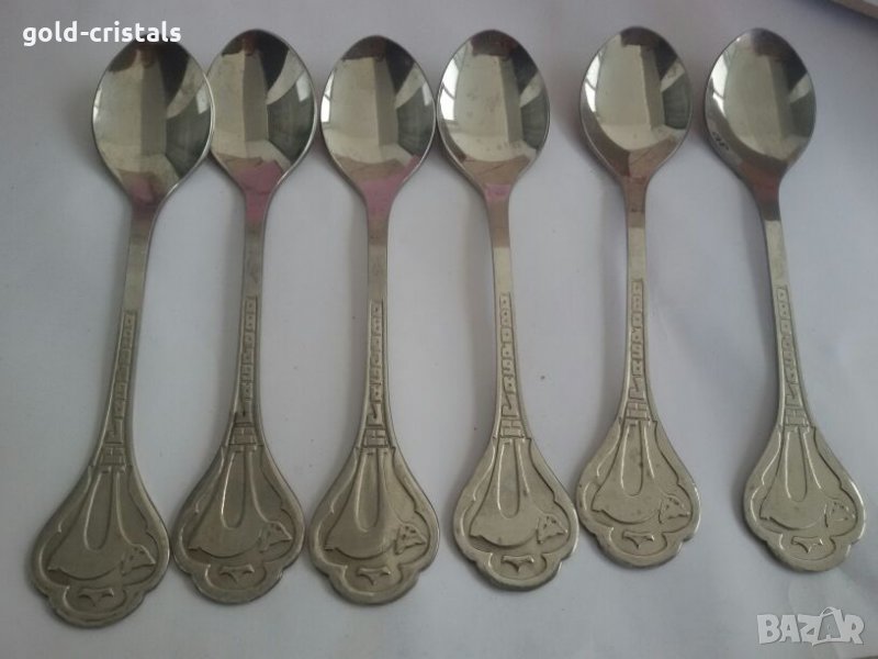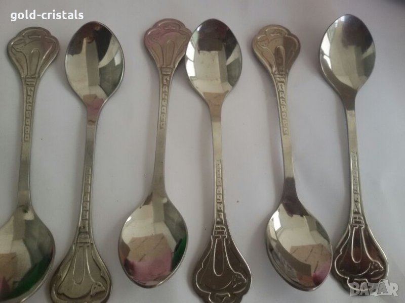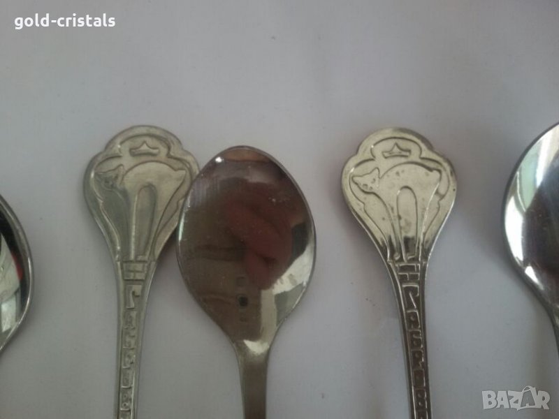 Изключително редки български прибори за хранене лъжички за кафе чай Петко Денев Габрово с изображение на котка с отрязана опашка неръждаеми маркирани 6 бр десертни ретро арт декор винтидж колекция сервиз комплект сет лот стари антикварни предмети обзавеждане за дома и семейството подходящи за подарък за ценители и колекционери