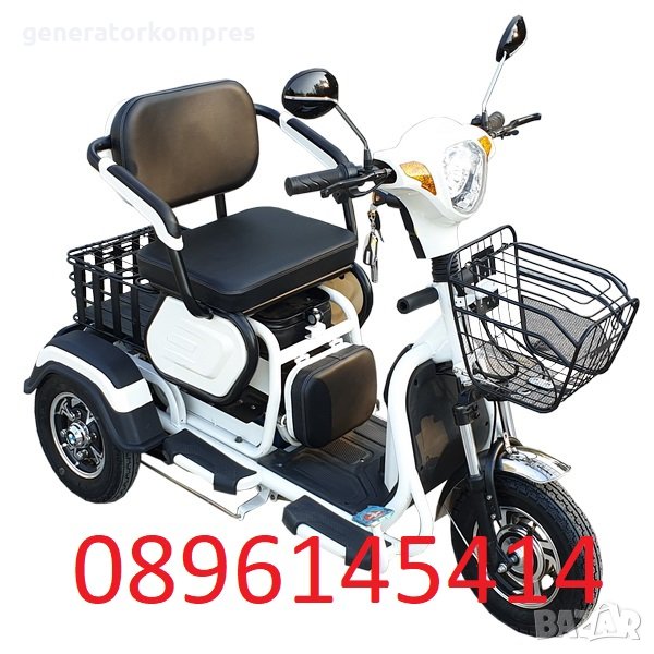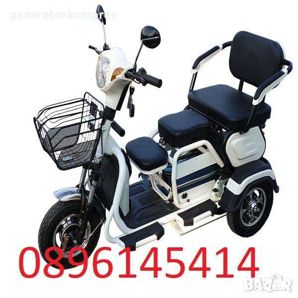 Предлагаме на Вашето внимание уникална двуместна триколка EGV C1 – без аналог на пазара.Триколката е с дигитално табло, три нива на скоростта, стопове, мигачи и габарити,LED фар.Предна и задна ръчни спирачки.Крачна спирачка.Голям кош за багаж.Триколката е с вградена втора седалка за допълнителен пасажер, като самата седалка се движи във височина, което създава удобство за нисък или висок човек.