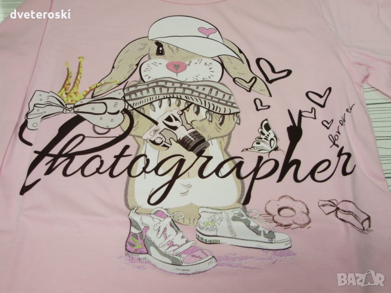 Пижамката с розово горнище и заек фотограф е на 15лв Ръст 122 - Горнище: дължина 43,5 см., ширина под мишници 32,5 см. дължина ръкав 43,5 см. от рамото. Долнище: дължина 70,5 см. от ластика, ханш 36 см., дълбочина 20 см, ширина на ластика 23 см, разпънат 37 см.