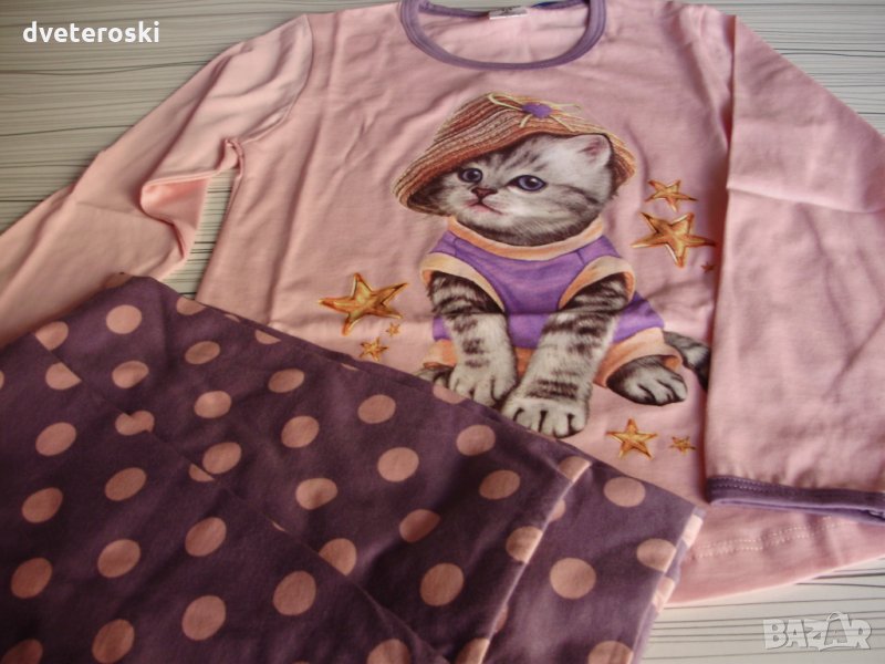 Ръст 122 на 14лв е пижамата с розово горнище и коте долнището е лилаво на бели точки. капарирана