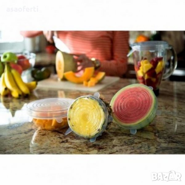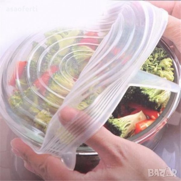 Сет от 6 силиконови капака, които запазват качествата на храната. Изработени от висококачествен силикон, тези капаци са изключително компактно решение за пестене на място във всяка кухня. Просто постави върху съответния размер купа, разпъни и натисни докато се покрие напълно, за да не остава въздух - така храната ще се съхрани свежа за по-дълго време. Извадена от хладилника, тя може директно да се претопли в микровълновата фурна, без да остави пръски по стените й. Лесно почистване под течаща вода или в съдомиялна машина.