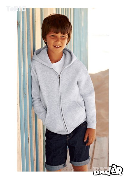 Детски суичър с цип Fruit of the Loom Елегантен суитчър с качулка, два предни джоба и цял метален цип.